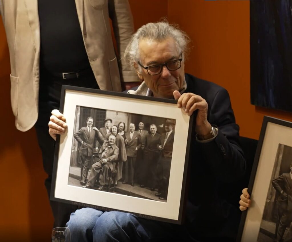 Op de foto zie je Geert van Bruaene op de stoel voor zijn café Het Goudblommeke in Papier/ La Fleur en Papier Doré en omringd door zijn vrienden. Van links naar rechts: Marcel Mariën, Camille Goemans, Irène Hamoir, Georgette Magritte, E.L.T. Mesens, Louis Scutenaire, Réné Magritte en Paul Collinet.